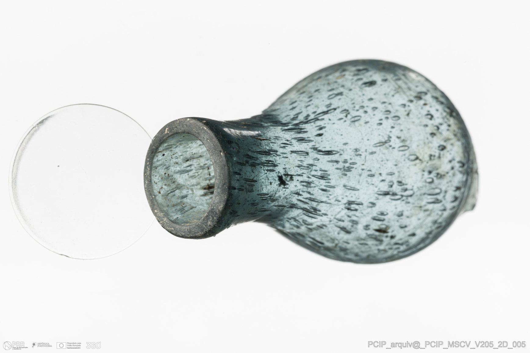 Matéria/Técnica: Vidro; Cronologia: Século XVII; Autoria: Desconhecida; Dimensões: Diâmetro bordo: 15mm.