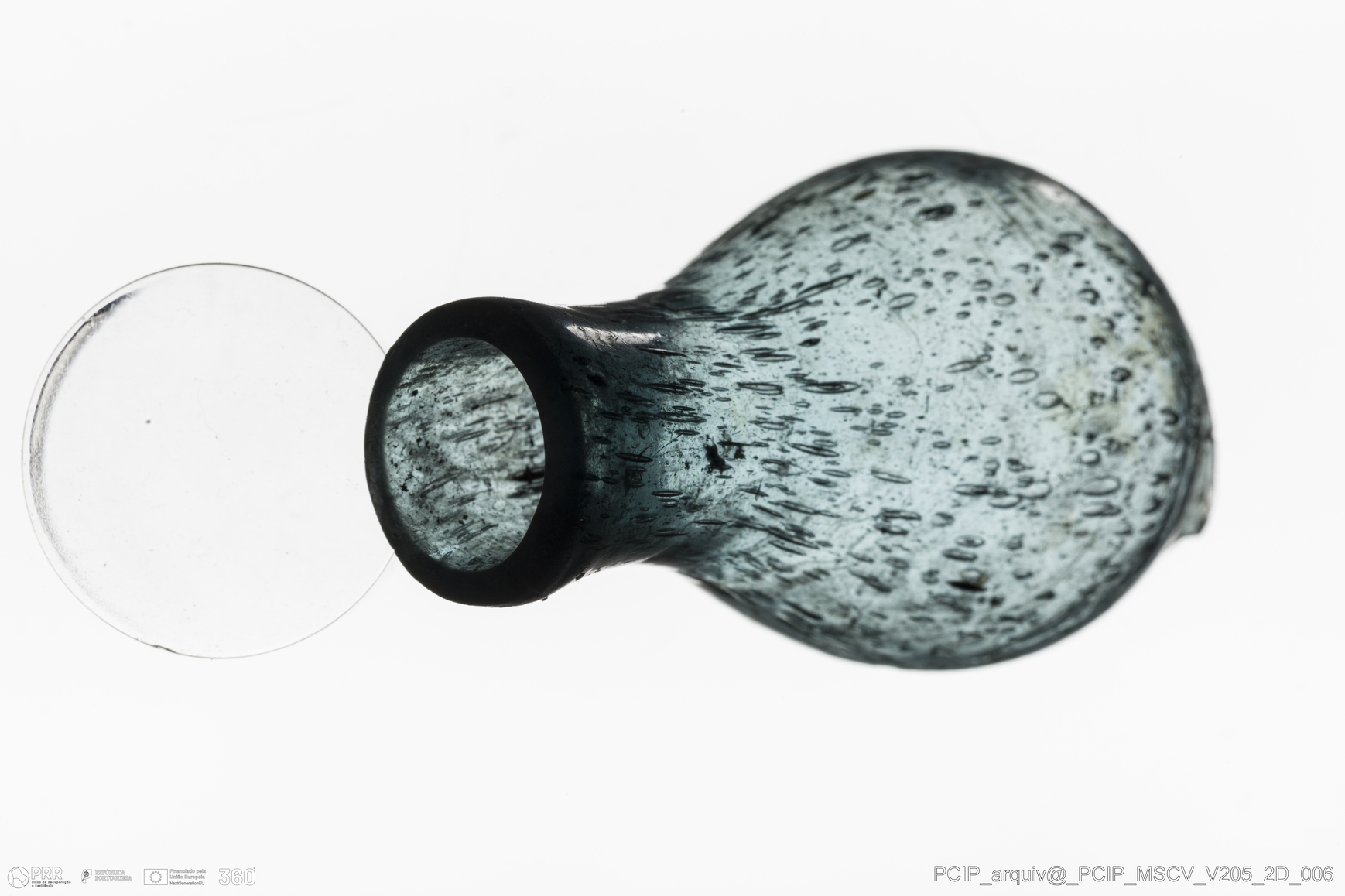 Matéria/Técnica: Vidro; Cronologia: Século XVII; Autoria: Desconhecida; Dimensões: Diâmetro bordo: 15mm.