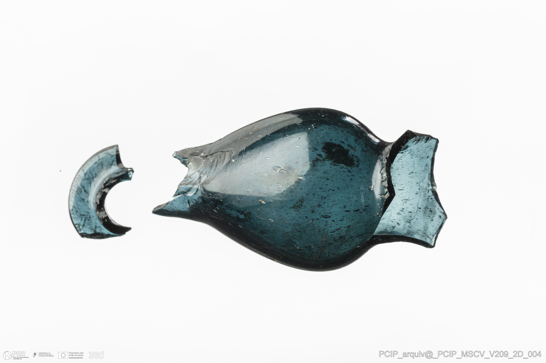 Matéria/Técnica: Vidro; Cronologia: Século XVII; Autoria: Desconhecida; Dimensões: Diâmetro bordo: 26mm.