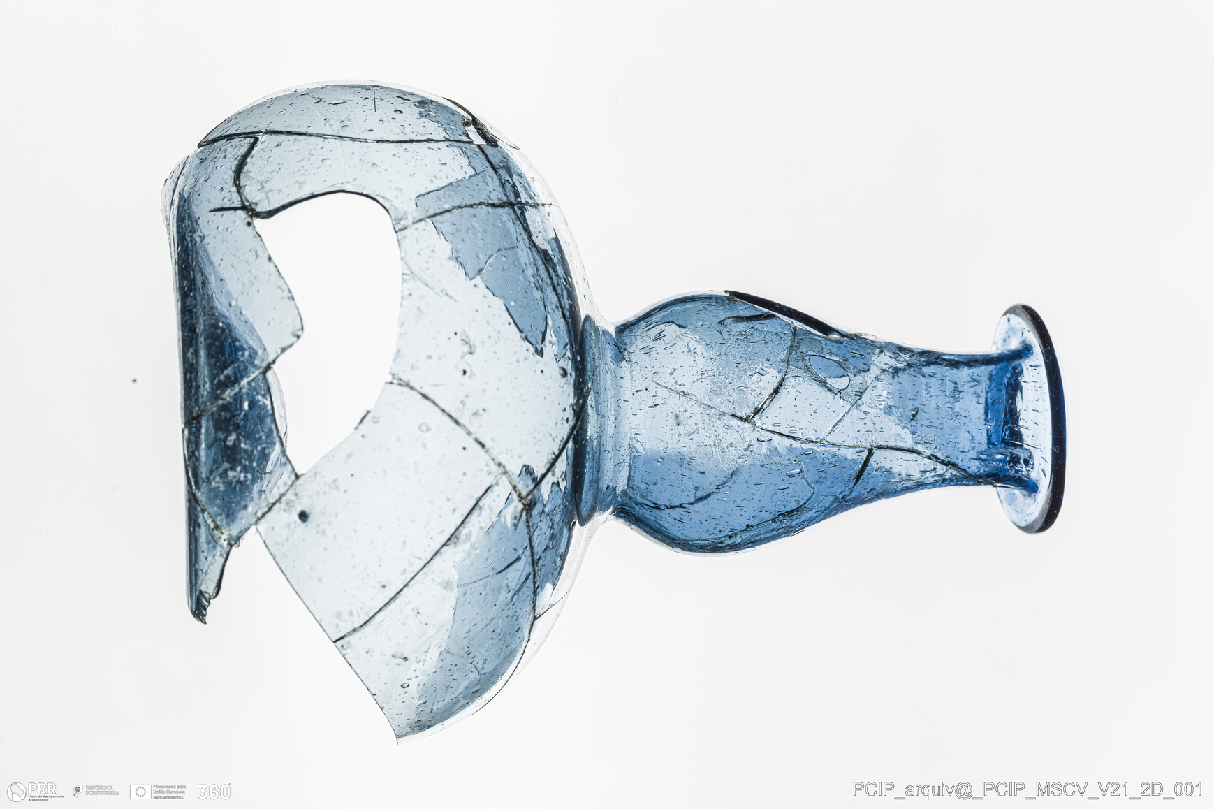 Matéria/Técnica: Vidro; Cronologia: Século XVII; Autoria: Desconhecida; Dimensões: Diâmetro bordo: 27mm; Diâmetro base: 64mm; Altura: 106mm.