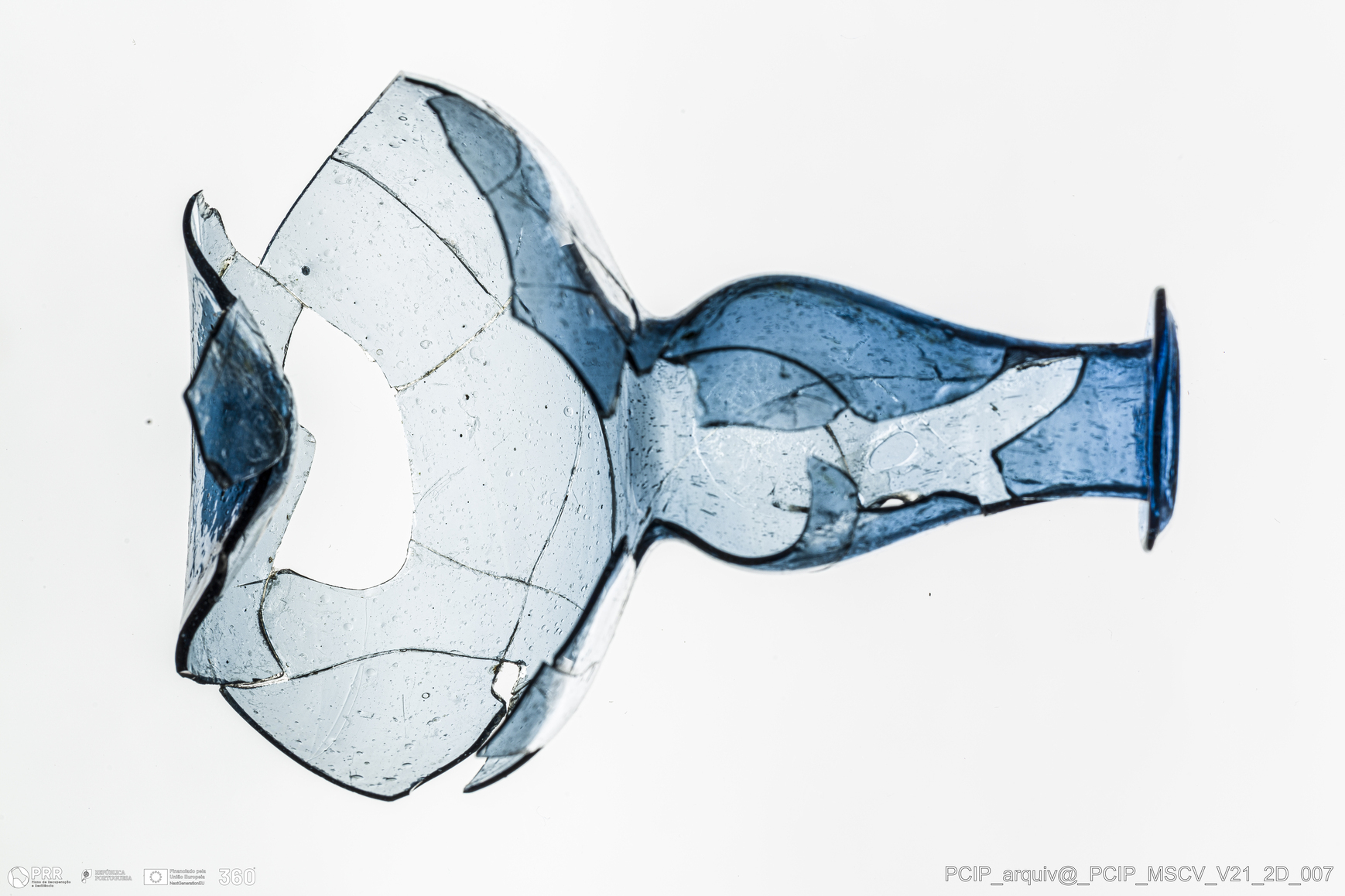 Matéria/Técnica: Vidro; Cronologia: Século XVII; Autoria: Desconhecida; Dimensões: Diâmetro bordo: 27mm; Diâmetro base: 64mm; Altura: 106mm.