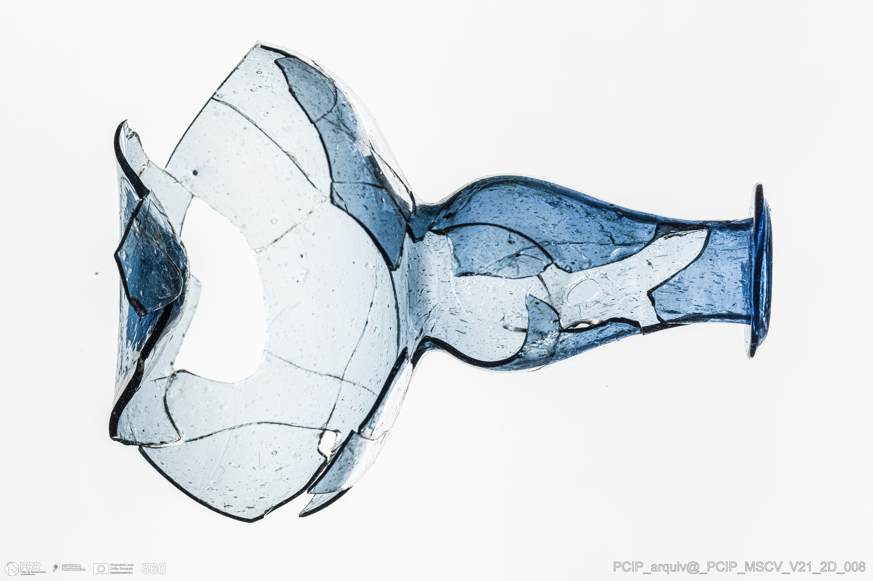 Matéria/Técnica: Vidro; Cronologia: Século XVII; Autoria: Desconhecida; Dimensões: Diâmetro bordo: 27mm; Diâmetro base: 64mm; Altura: 106mm.