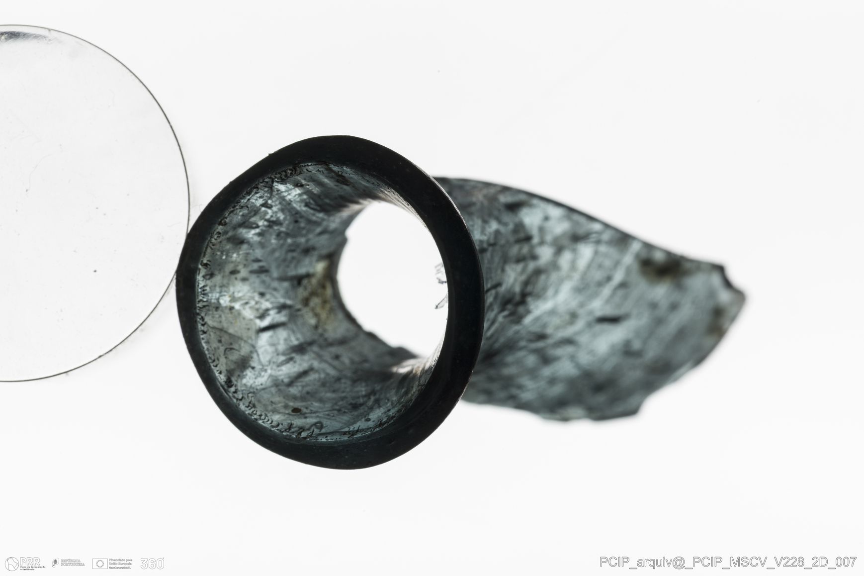 Matéria/Técnica: Vidro; Cronologia: Século XVII; Autoria: Desconhecida; Dimensões: Diâmetro bordo: 18mm.