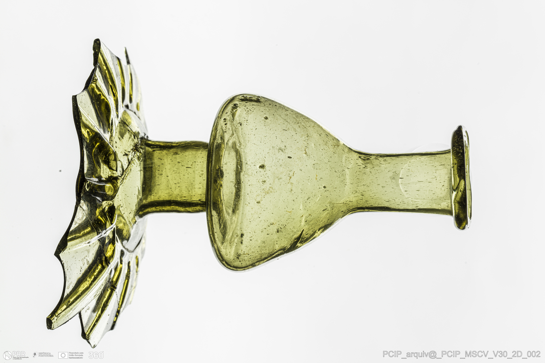 Matéria/Técnica: Vidro; Cronologia: Século XVII; Autoria: Desconhecida; Dimensões: Diâmetro Bordo: 27mm.