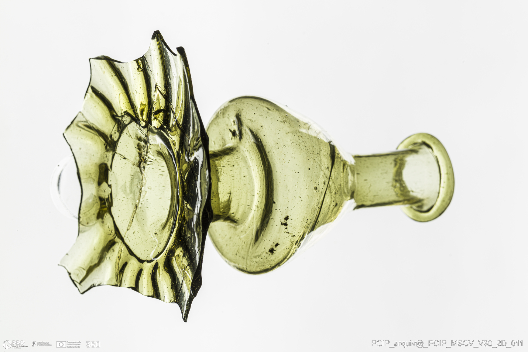 Matéria/Técnica: Vidro; Cronologia: Século XVII; Autoria: Desconhecida; Dimensões: Diâmetro Bordo: 27mm.