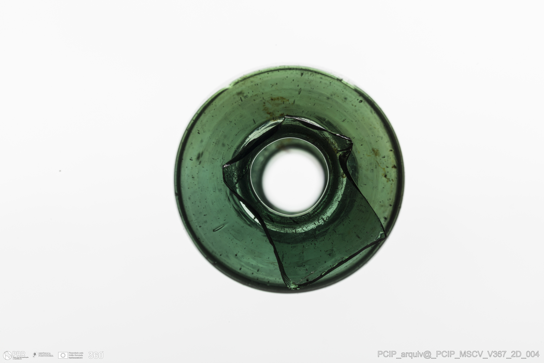Matéria/Técnica: Vidro; Cronologia: Século XVII; Autoria: Desconhecida; Dimensões: Diâmetro bordo: 15mm.