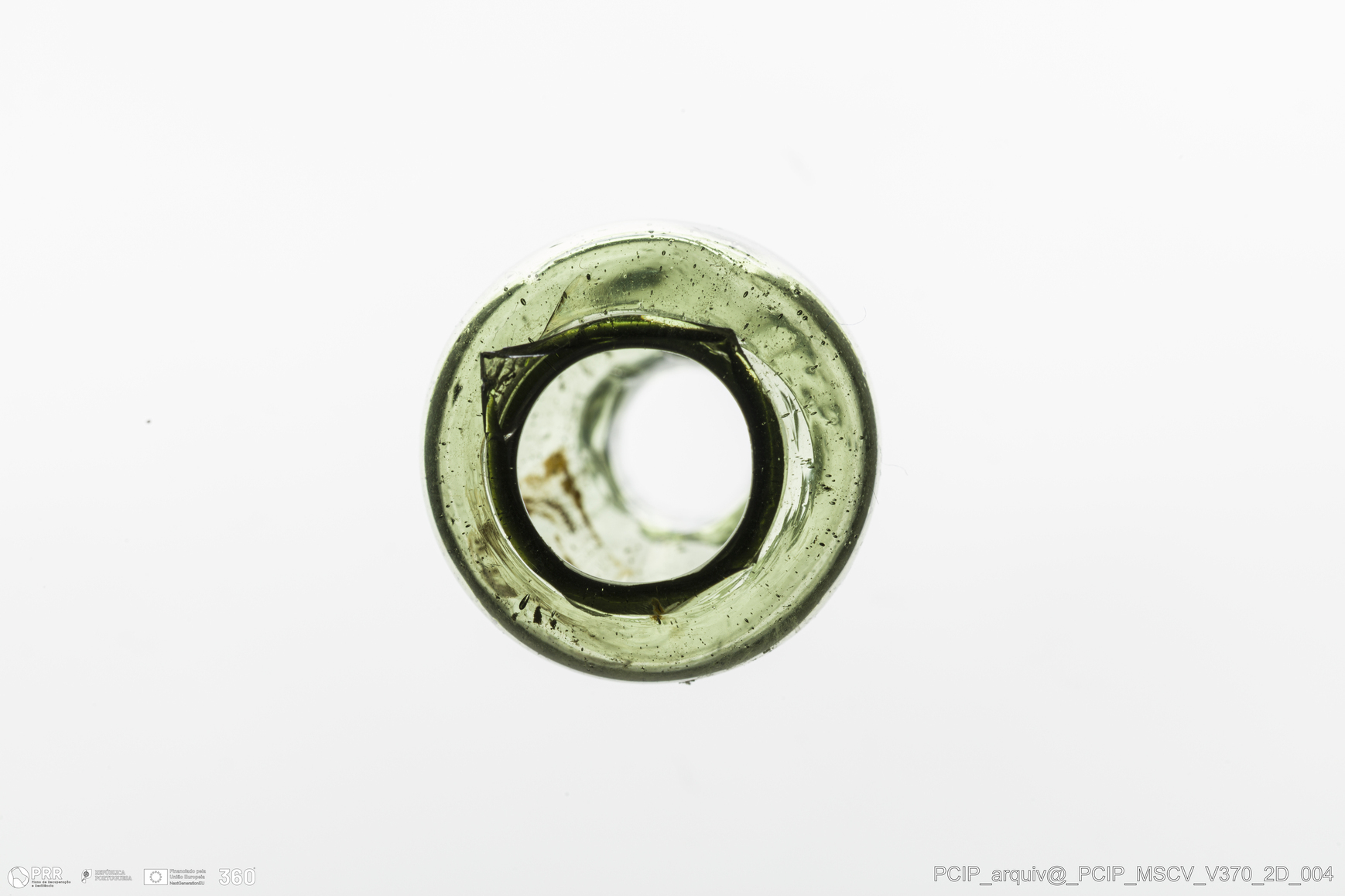 Matéria/Técnica: Vidro; Cronologia: Século XVII; Autoria: Desconhecida; Dimensões: Diâmetro bordo: 14mm.