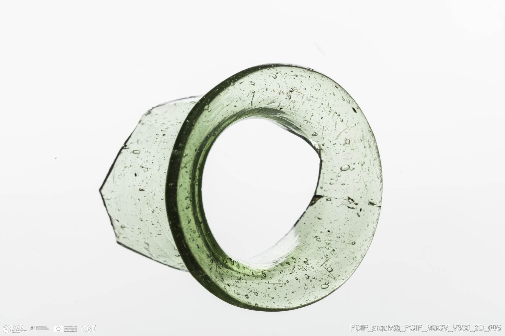 Matéria/Técnica: Vidro; Cronologia: Século XVII; Autoria: Desconhecida; Dimensões: Diâmetro bordo: 34mm.