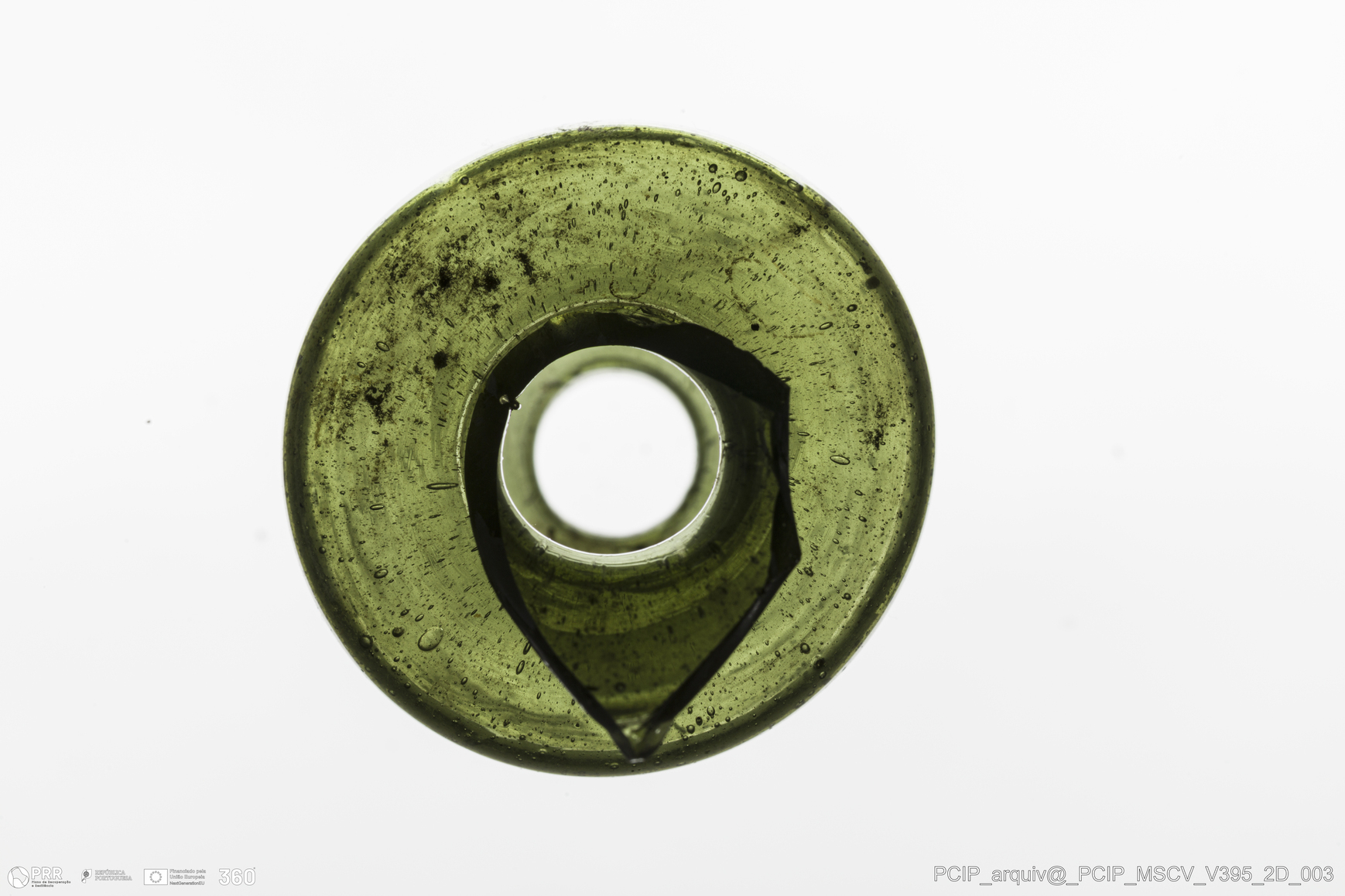 Matéria/Técnica: Vidro; Cronologia: Século XVII; Autoria: Desconhecida; Dimensões: Diâmetro bordo: 24mm.