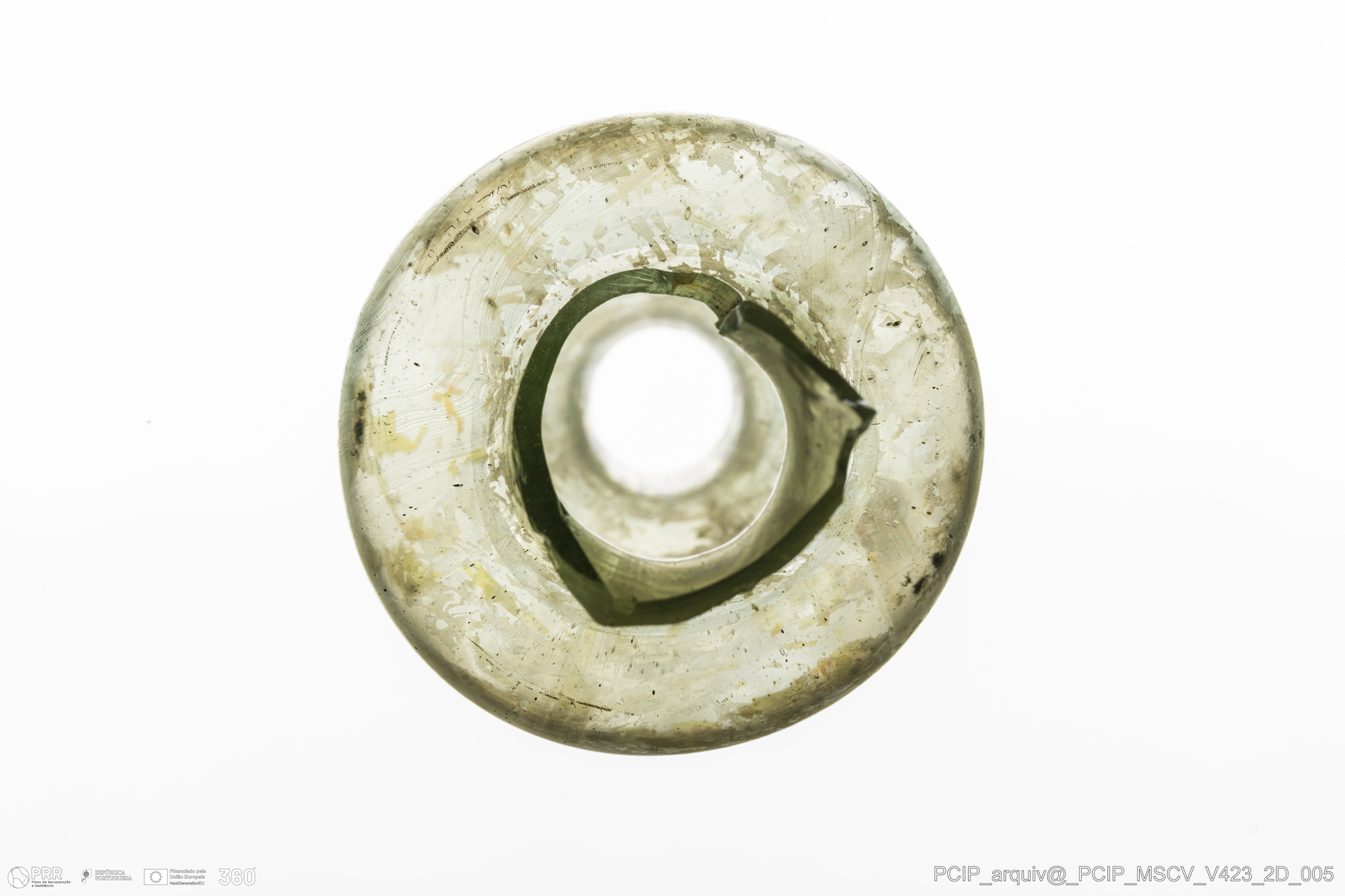 Matéria/Técnica: Vidro; Cronologia: Século XVII; Autoria: Desconhecida; Dimensões: Diâmetro bordo: 26mm.