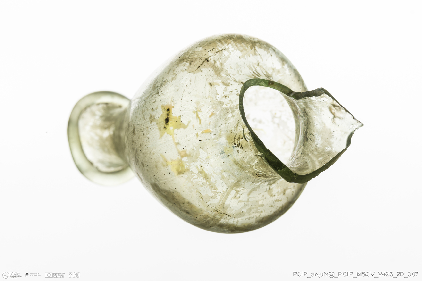 Matéria/Técnica: Vidro; Cronologia: Século XVII; Autoria: Desconhecida; Dimensões: Diâmetro bordo: 26mm.