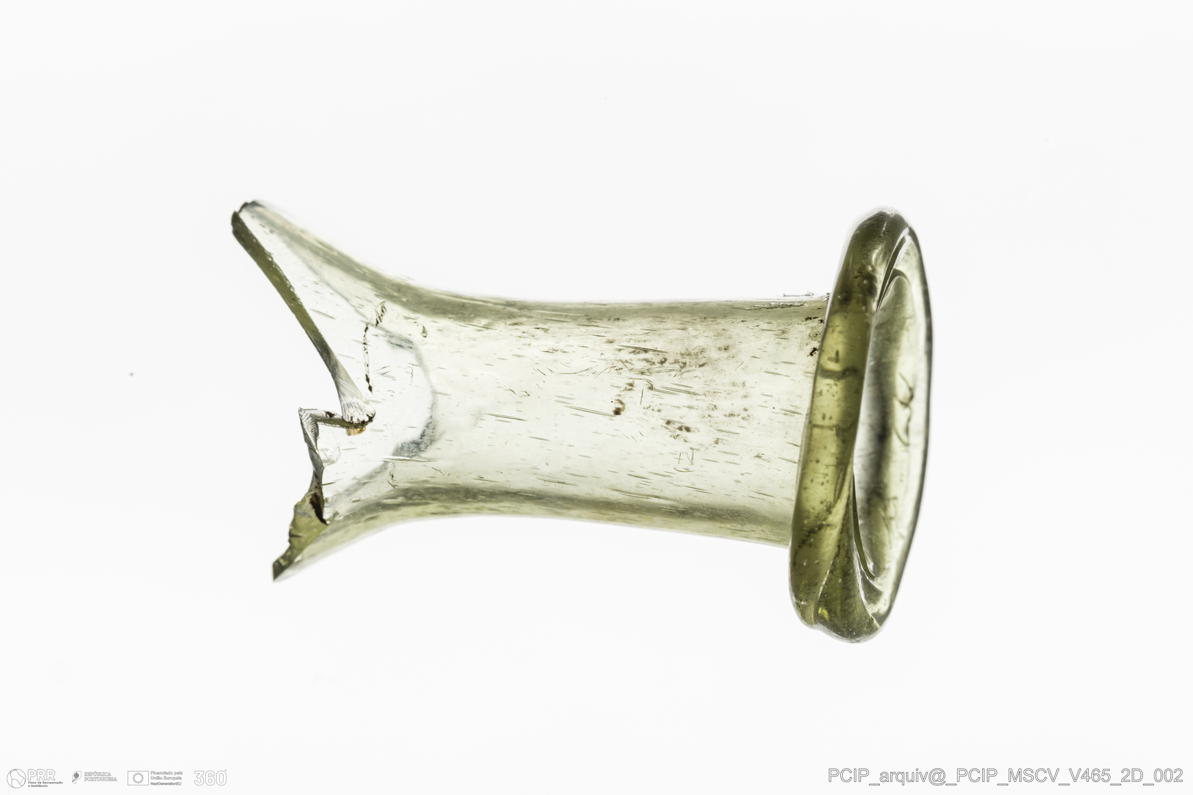 Matéria/Técnica: Vidro; Cronologia: Século XVII; Autoria: Desconhecida; Dimensões: Diâmetro Bordo: 26mm.