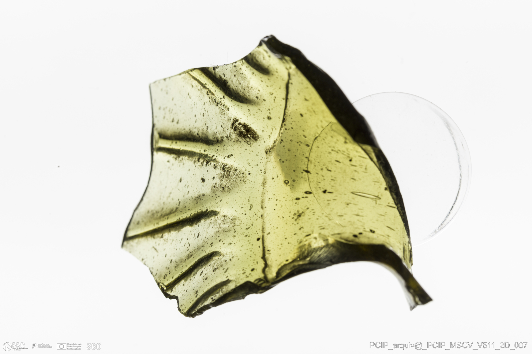 Matéria/Técnica: Vidro; Cronologia: Século XVII; Autoria: Desconhecida; Dimensões: Diâmetro Bordo: 27mm.