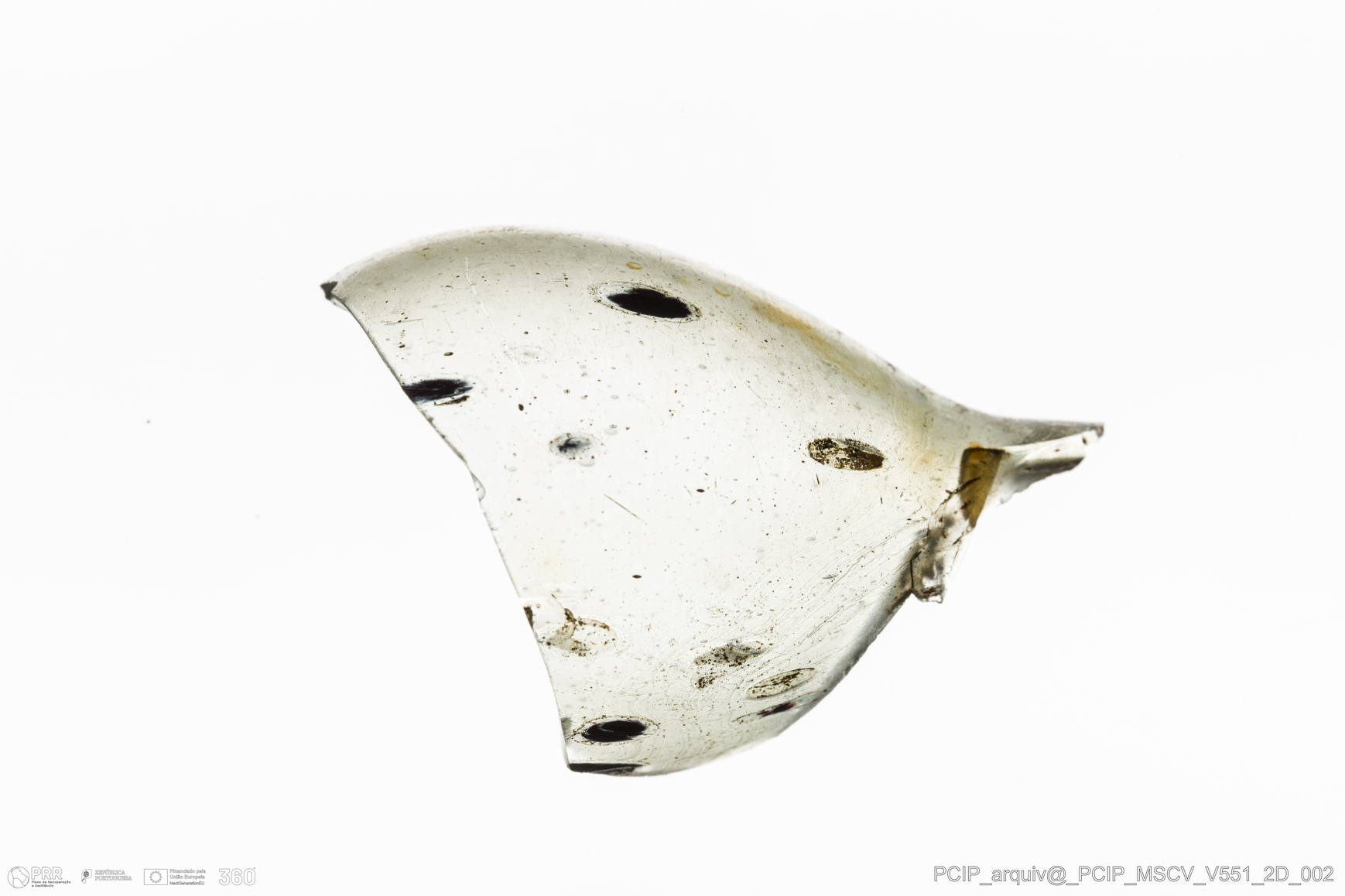 Matéria/Técnica: Vidro; Cronologia: Século XVII; Autoria: Desconhecida; Dimensões: Comprimento: 35mm; Largura: 30mm.