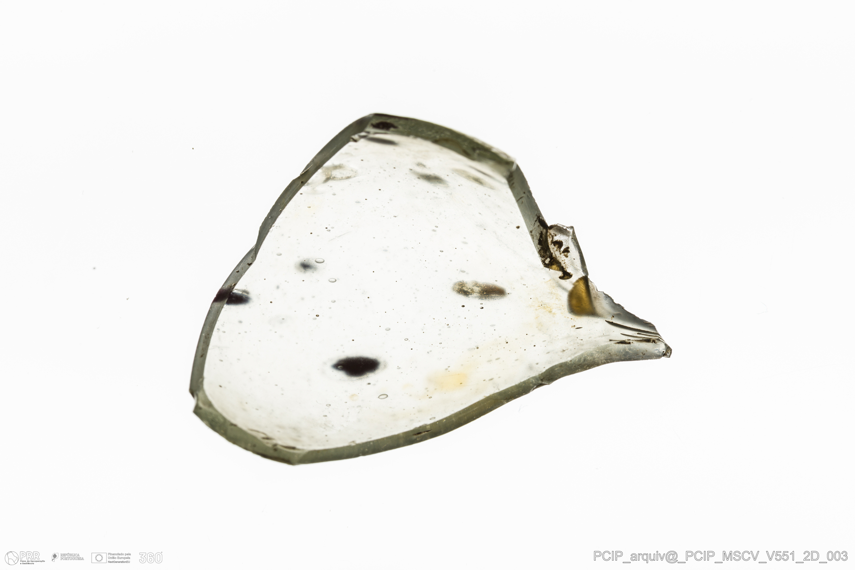 Matéria/Técnica: Vidro; Cronologia: Século XVII; Autoria: Desconhecida; Dimensões: Comprimento: 35mm; Largura: 30mm.