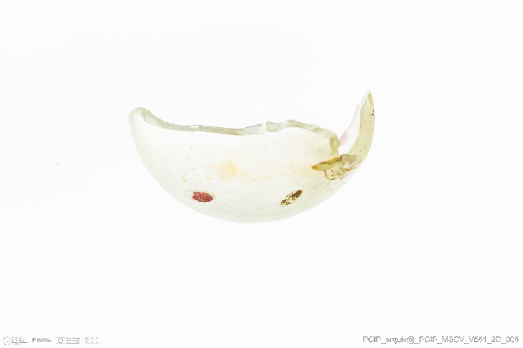 Matéria/Técnica: Vidro; Cronologia: Século XVII; Autoria: Desconhecida; Dimensões: Comprimento: 35mm; Largura: 30mm.