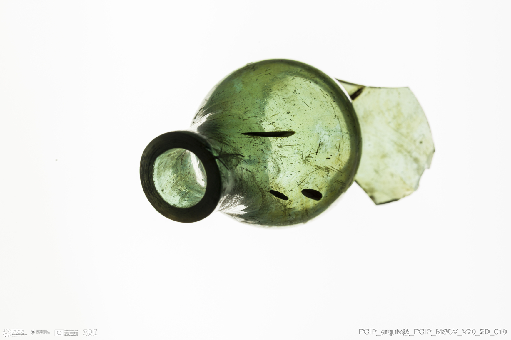 Matéria/Técnica: Vidro; Cronologia: Século XVII; Autoria: Desconhecida; Dimensões: Diâmetro bordo: 16mm.