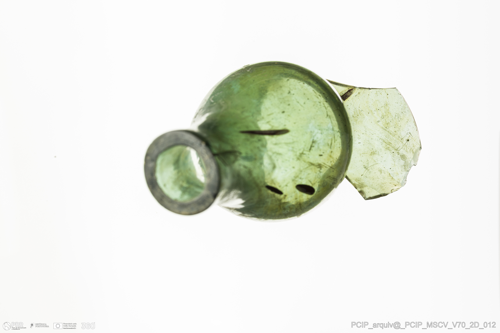 Matéria/Técnica: Vidro; Cronologia: Século XVII; Autoria: Desconhecida; Dimensões: Diâmetro bordo: 16mm.