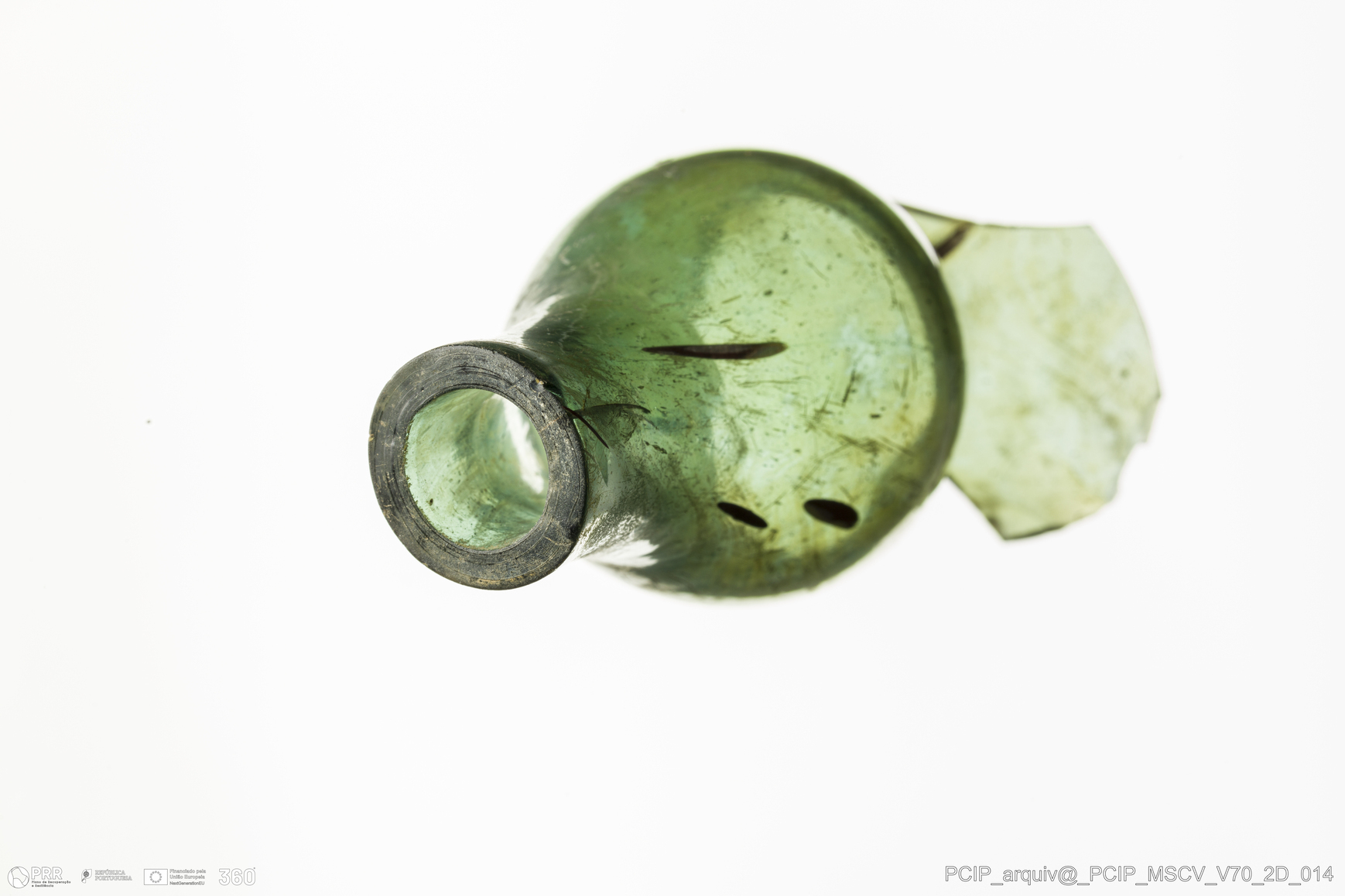 Matéria/Técnica: Vidro; Cronologia: Século XVII; Autoria: Desconhecida; Dimensões: Diâmetro bordo: 16mm.