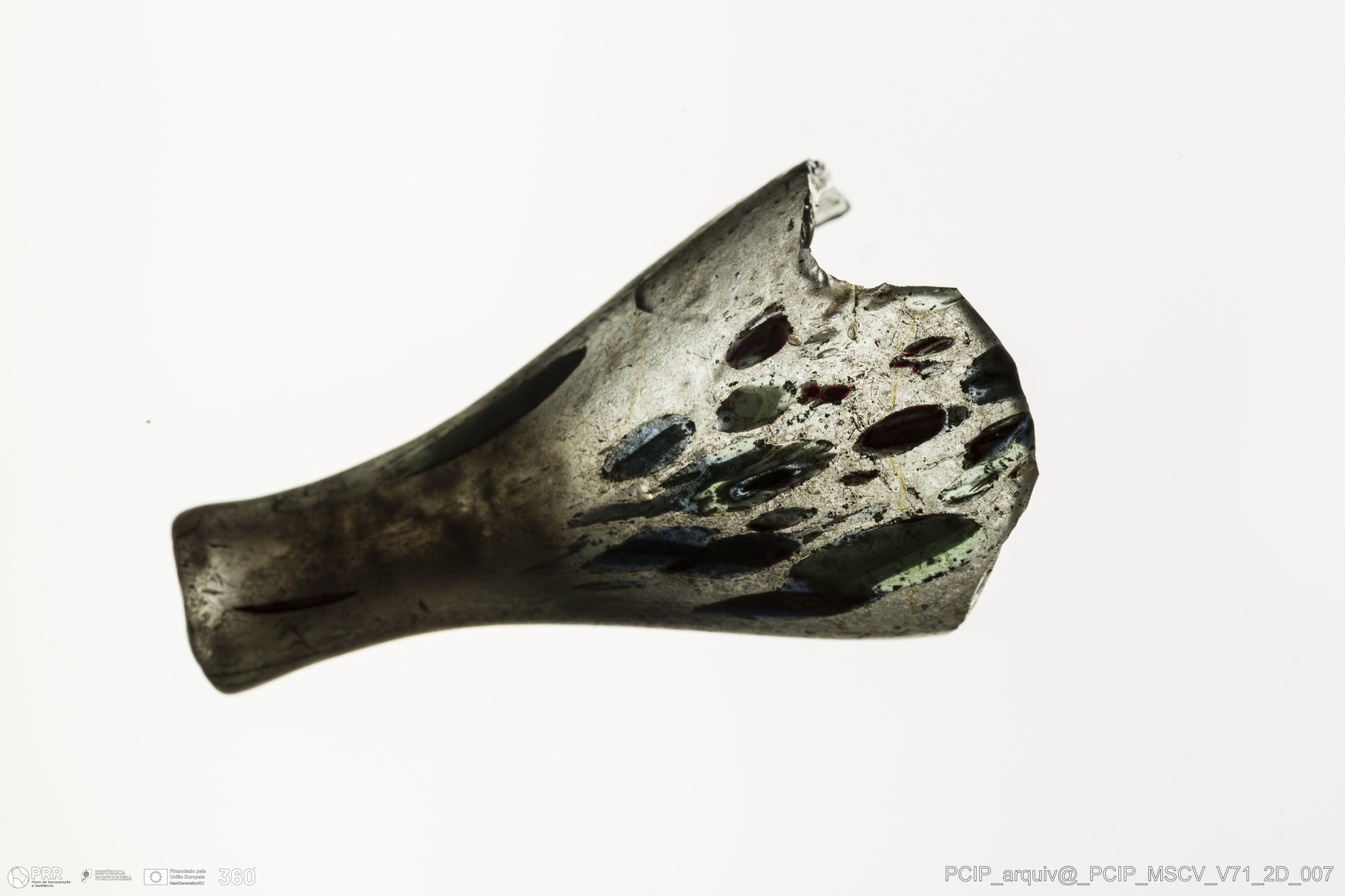 Matéria/Técnica: Vidro; Cronologia: Século XVII; Autoria: Desconhecida; Dimensões: Diâmetro bordo: 10mm.