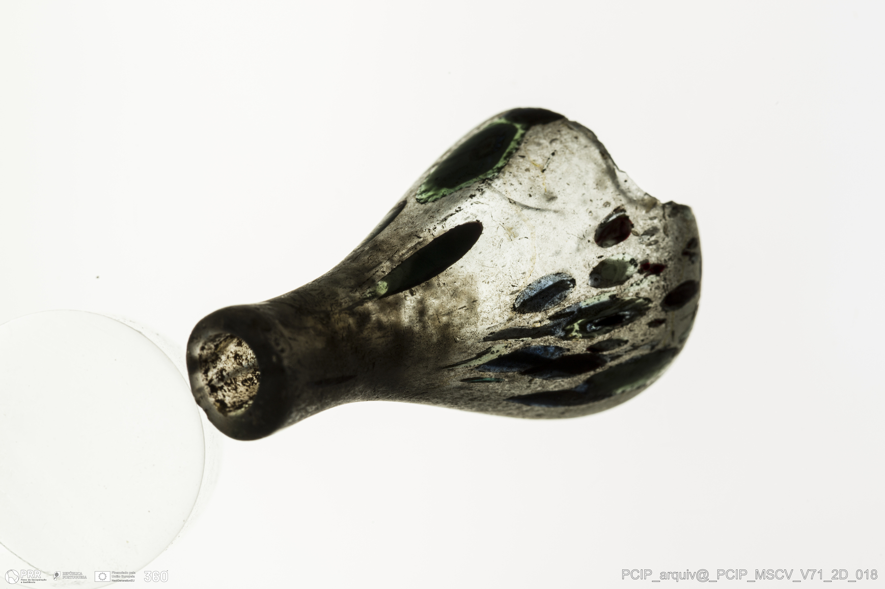 Matéria/Técnica: Vidro; Cronologia: Século XVII; Autoria: Desconhecida; Dimensões: Diâmetro bordo: 10mm.