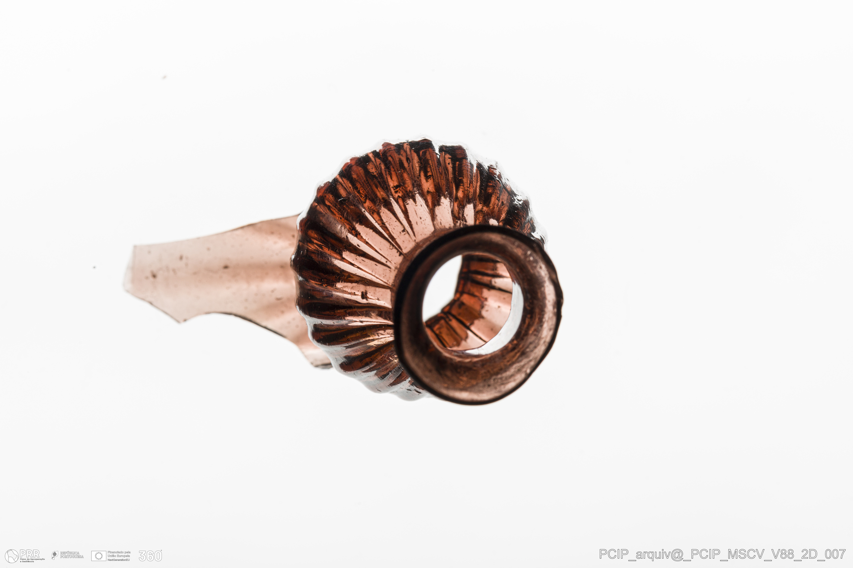 Matéria/Técnica: Vidro; Cronologia: Século XVII; Autoria: Desconhecida; Dimensões: Diâmetro bordo: 20mm.