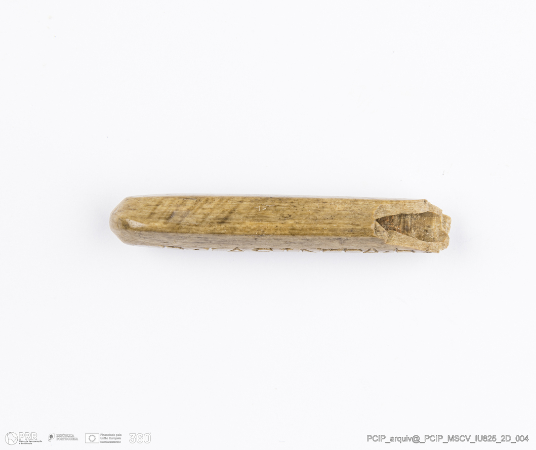 Matéria/Técnica: Osso; Cronologia: Século XVII; Autoria: Desconhecida; Dimensões: Comprimento: 52mm; Largura: 12mm; Espessura: 8,5.