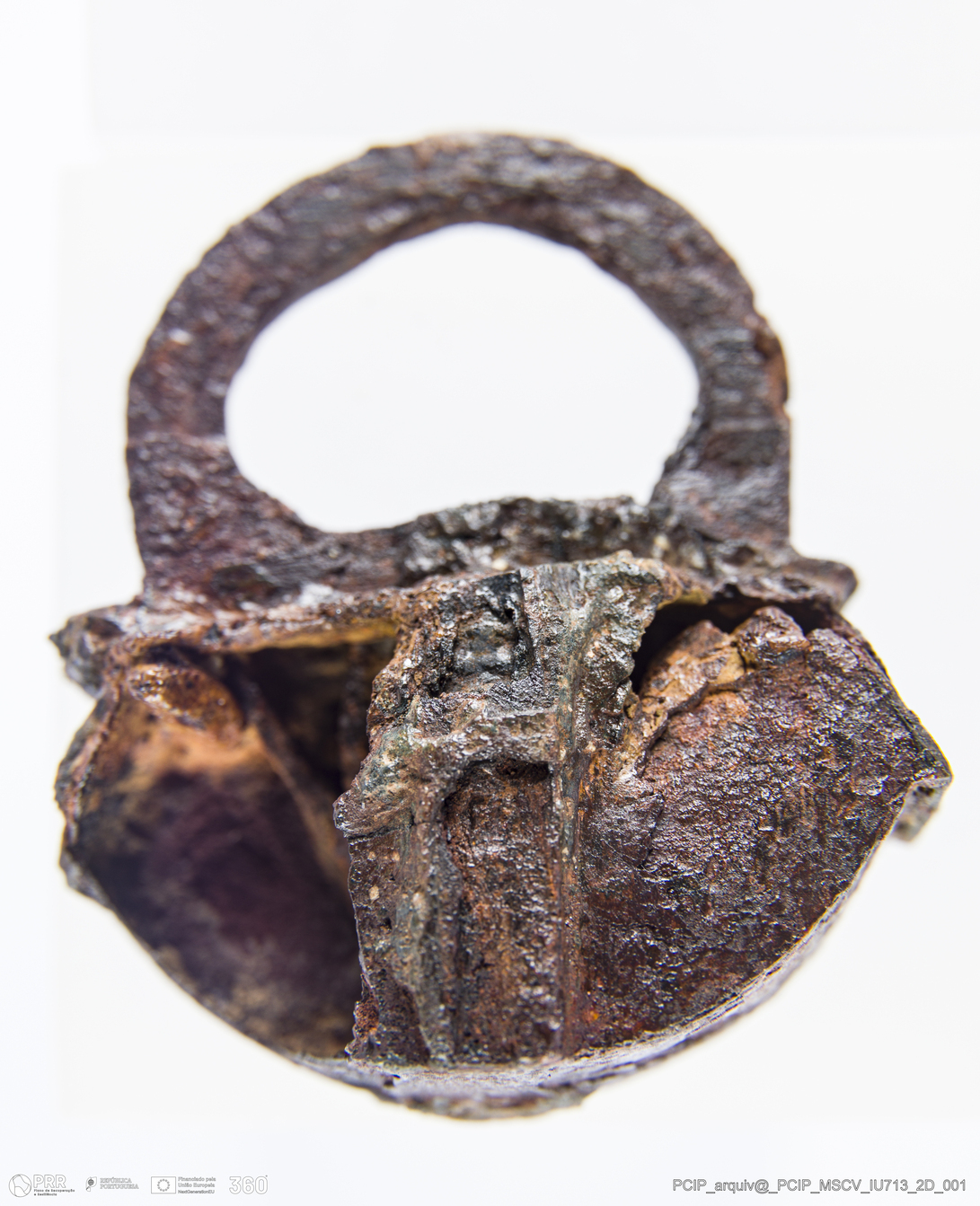 Matéria/Técnica: Ferro; Cronologia: Século XVII; Autoria: Desconhecida; Dimensões: Altura: 48mm; Largura: 42mm; Diâmetro do aro: 33mm; Espessura: 20mm.