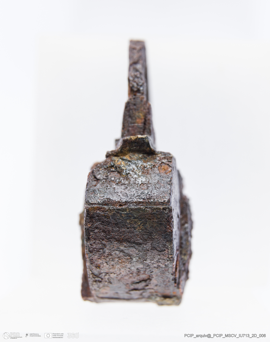 Matéria/Técnica: Ferro; Cronologia: Século XVII; Autoria: Desconhecida; Dimensões: Altura: 48mm; Largura: 42mm; Diâmetro do aro: 33mm; Espessura: 20mm.