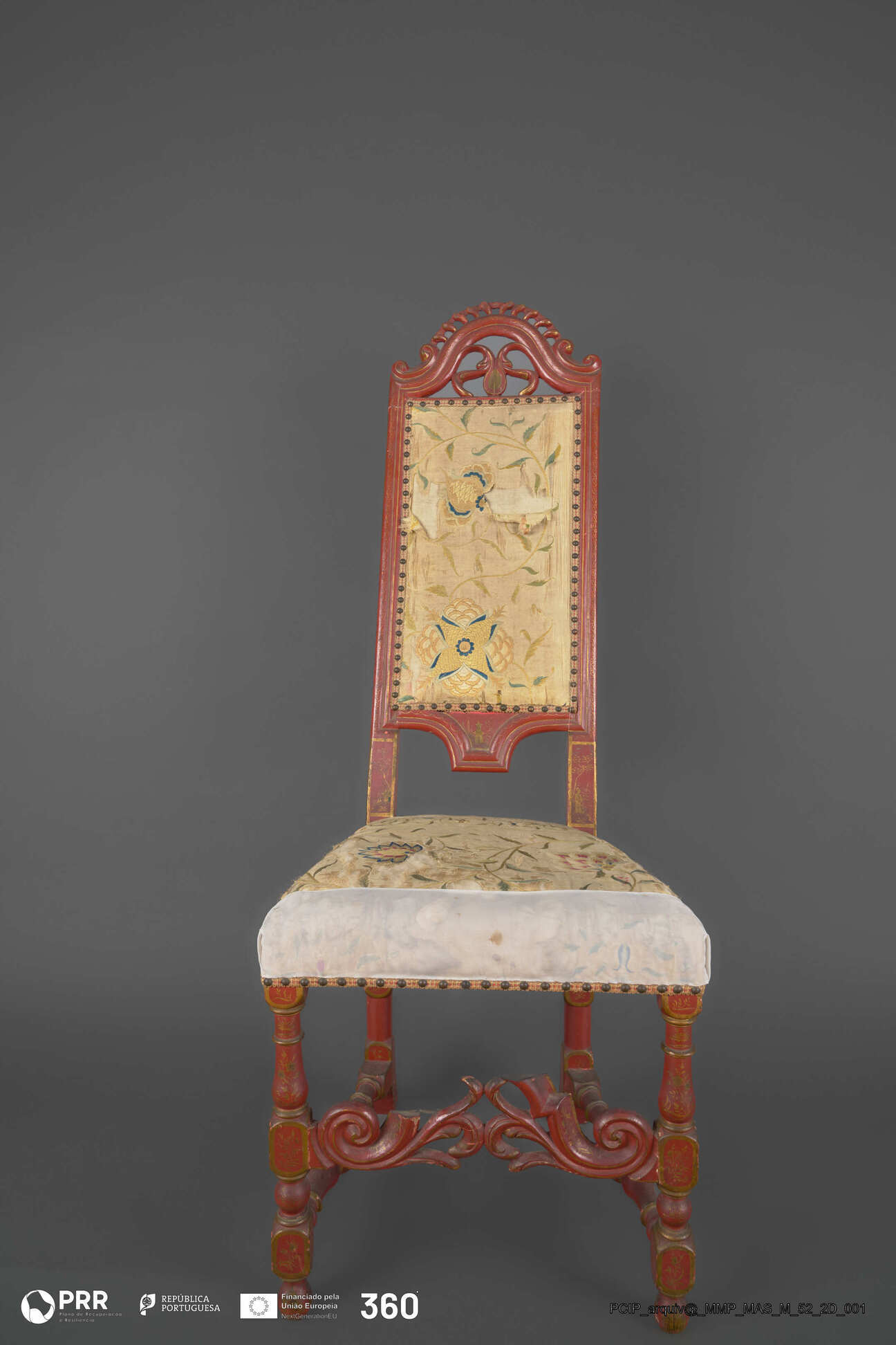 Matéria/Técnica: Madeira entalhada, torneada e policromada (pintura acharoada ); seda bordada a sedas polícromas; Cronologia: Século XVIII; Autoria: Desconhecida; Dimensões: Altura: 136 cm x Largura: 63 cm x Comprimento: 50 cm.