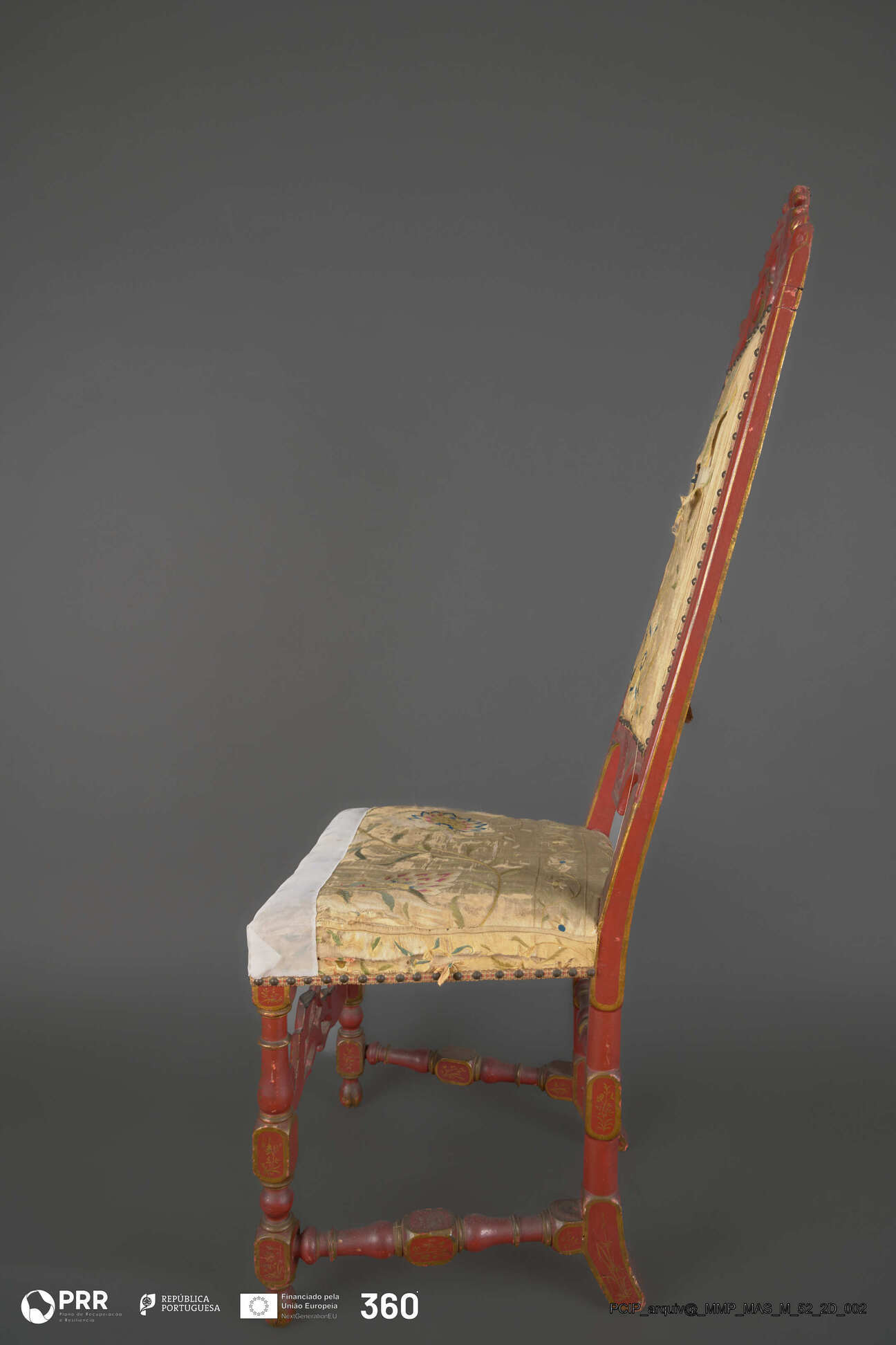 Matéria/Técnica: Madeira entalhada, torneada e policromada (pintura acharoada ); seda bordada a sedas polícromas; Cronologia: Século XVIII; Autoria: Desconhecida; Dimensões: Altura: 136 cm x Largura: 63 cm x Comprimento: 50 cm.