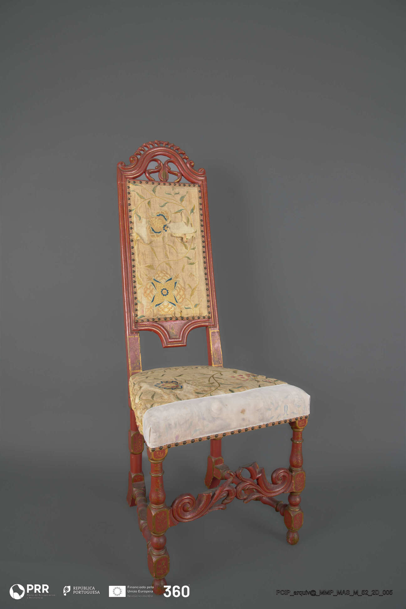 Matéria/Técnica: Madeira entalhada, torneada e policromada (pintura acharoada ); seda bordada a sedas polícromas; Cronologia: Século XVIII; Autoria: Desconhecida; Dimensões: Altura: 136 cm x Largura: 63 cm x Comprimento: 50 cm.