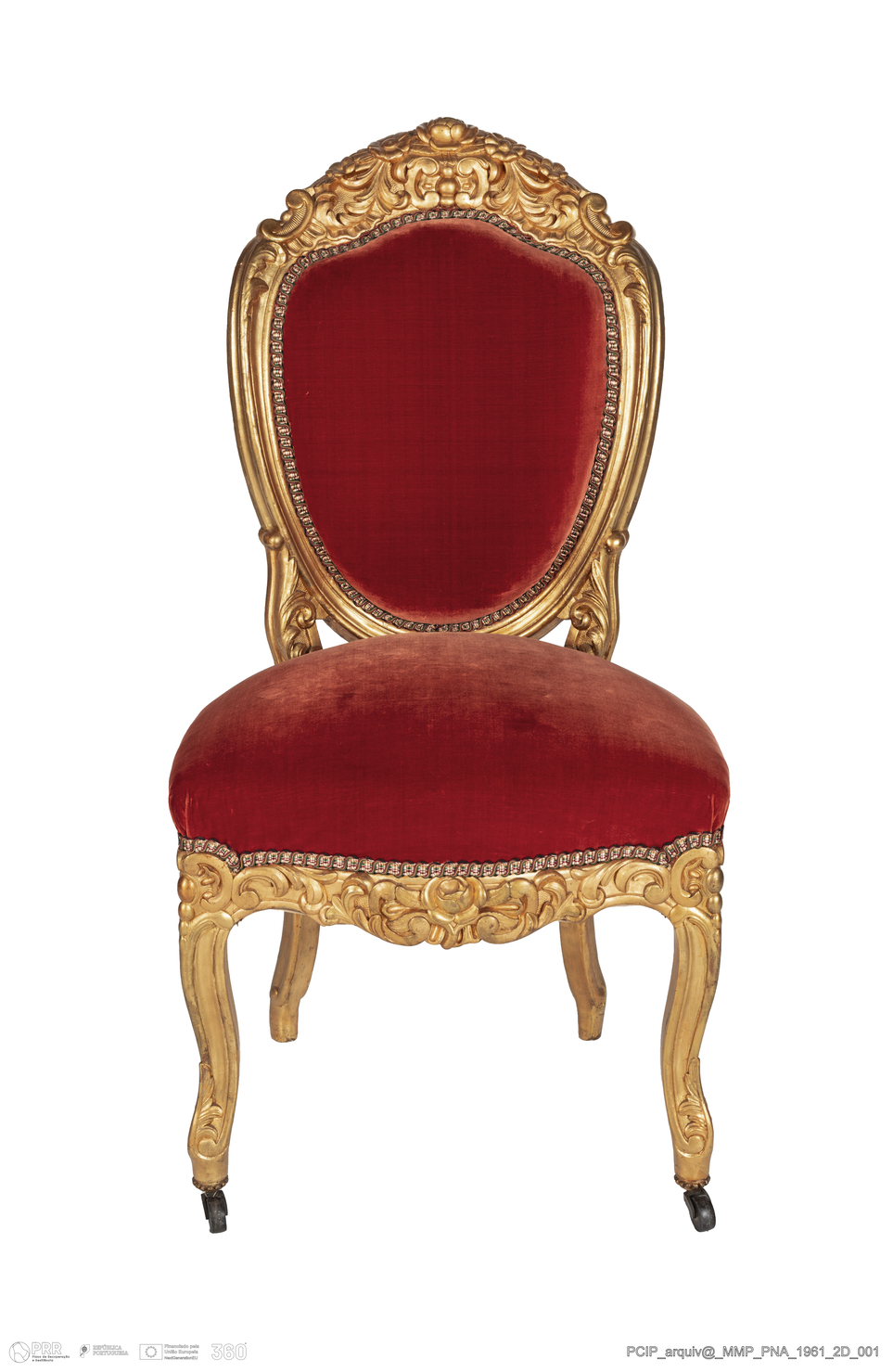 Matéria/Técnica: Madeira de (?); veludo de seda; galão de seda; purpurina/ouro verdadeiro e de imitação (?); rodízios; Cronologia: 1862 - 1889; Autoria: Desconhecida; Dimensões (cm): Altura: 1000; Largura: 52,0; Profundidade: 53,0.
