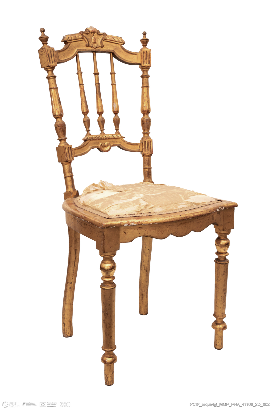 Matéria/Técnica: Madeira de (?); palhinha; folha de ouro; Cronologia: Século XIX; Autoria: Desconhecida; Dimensões (cm): Altura: 90,0; Largura: 42,5; Profundidade: 42.