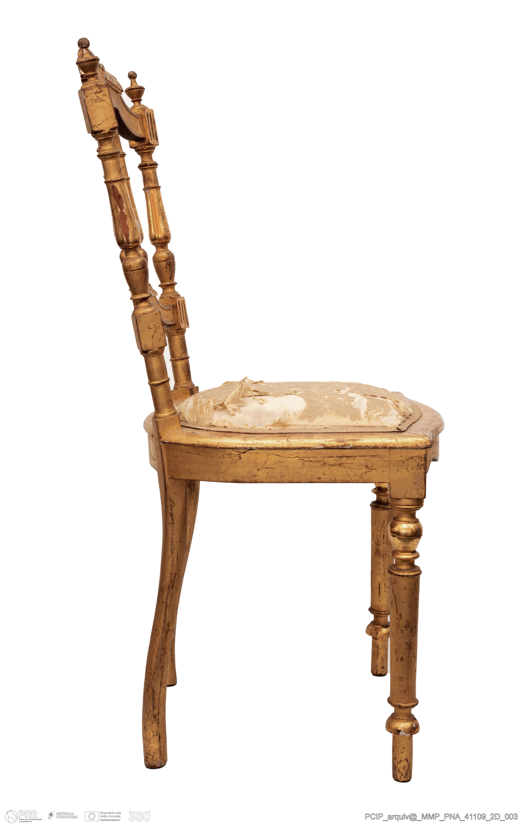 Matéria/Técnica: Madeira de (?); palhinha; folha de ouro; Cronologia: Século XIX; Autoria: Desconhecida; Dimensões (cm): Altura: 90,0; Largura: 42,5; Profundidade: 42.