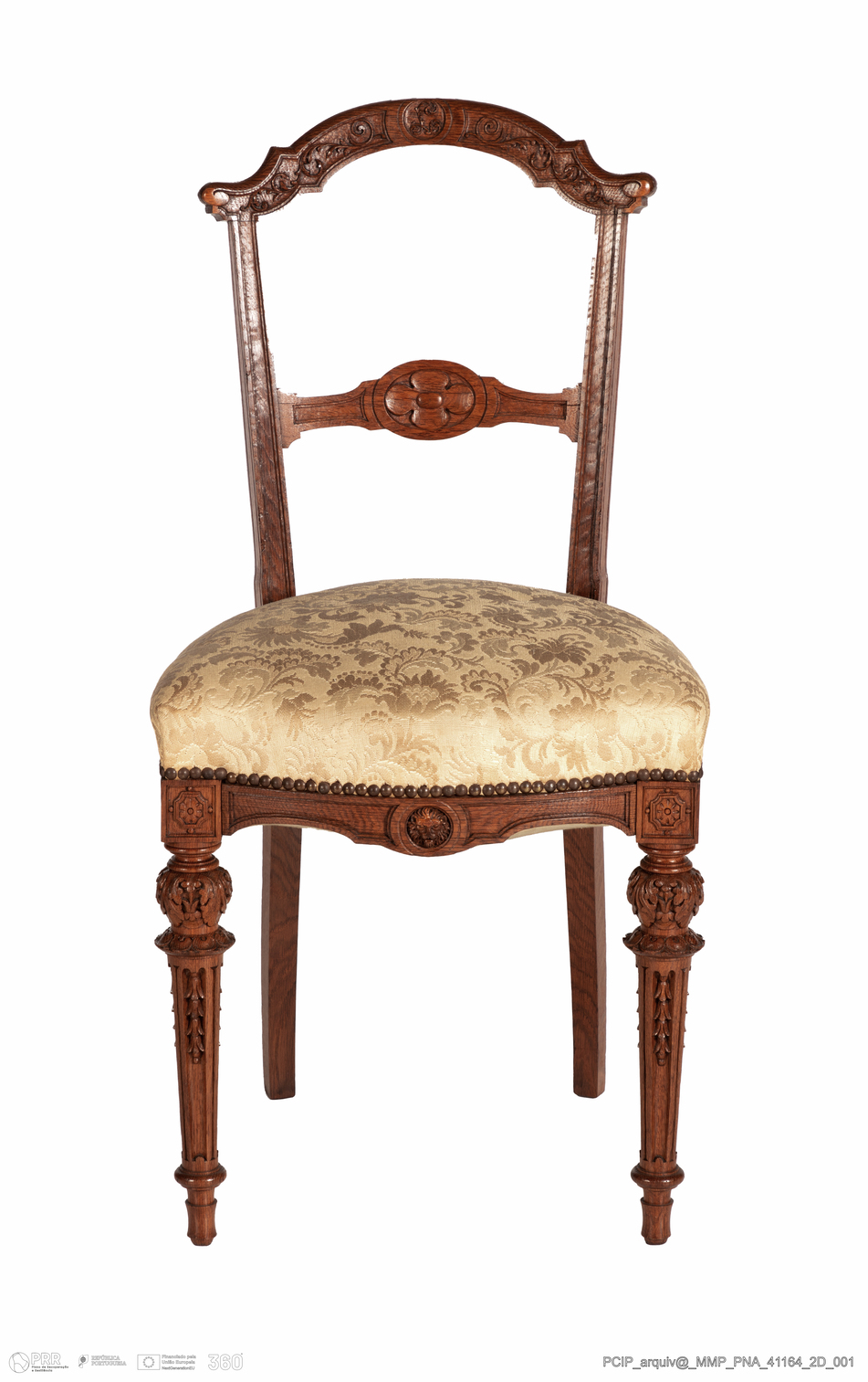Matéria/Técnica: Madeira de carvalho; algodão brocado; pregaria de metal amarelo; Cronologia: 1860; Autoria: Desconhecida; Dimensões (cm): Altura: 92,0; Largura: 46,0; Profundidade: 50,0.