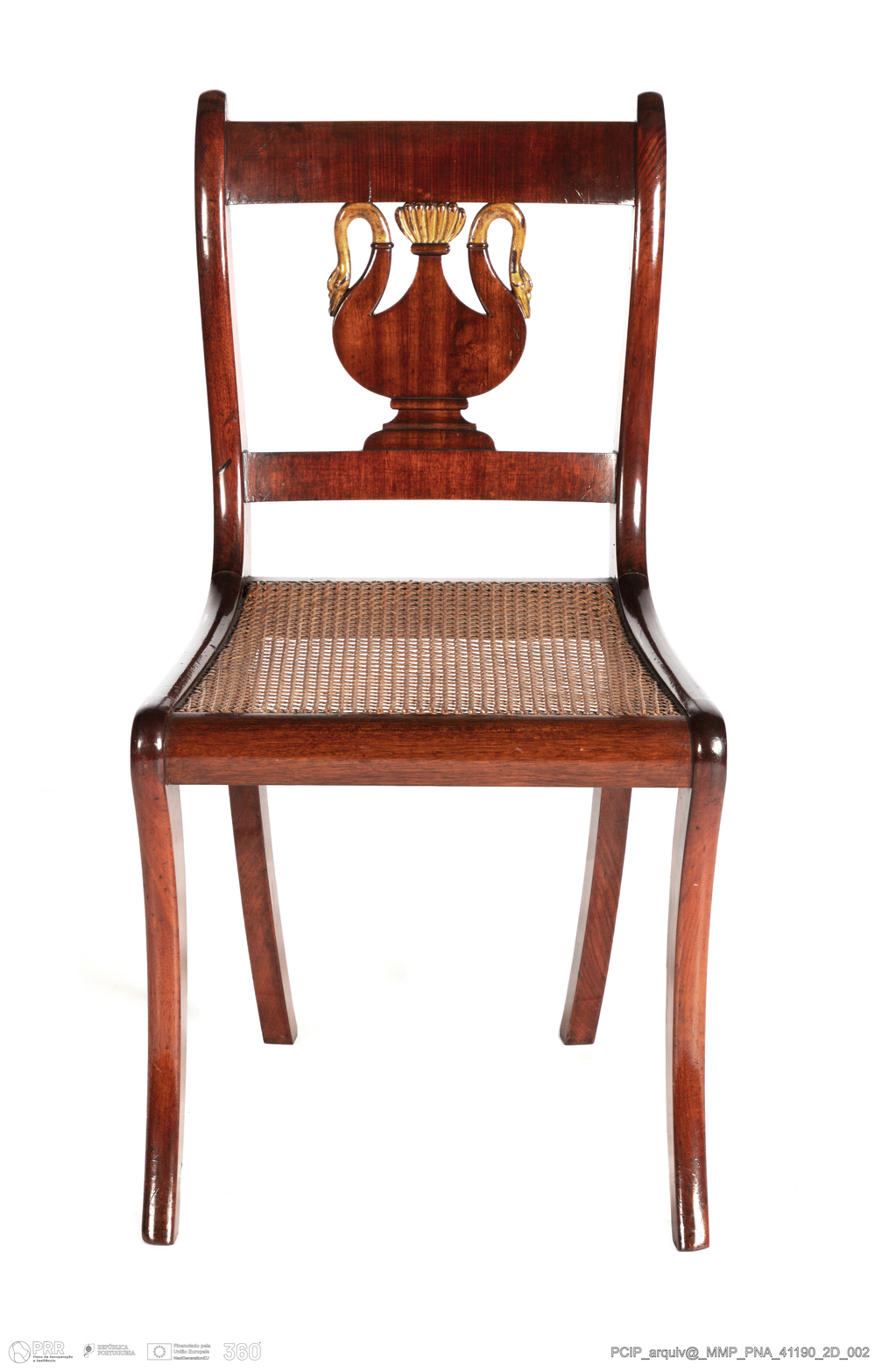 Matéria/Técnica: Madeira de mogno; palhinha; folha de ouro; Cronologia: Século XIX; Autoria: Desconhecida; Dimensões (cm): Altura: 83,0; Largura: 45,0; Profundidade: 47,5.