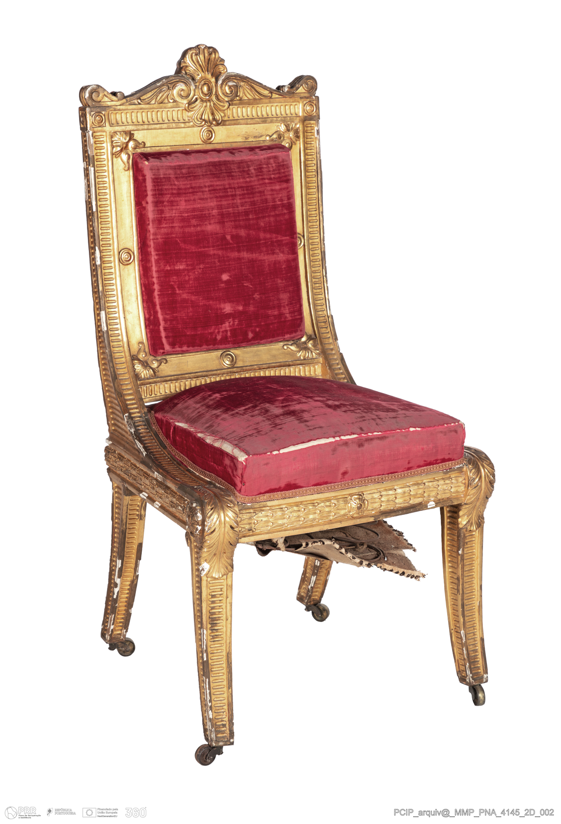 Matéria/Técnica: Madeira de (?); veludo de seda; folha de ouro; Cronologia: 1815 - 1824; Autoria: Desconhecida; Dimensões (cm): Altura: 117,5; Largura: 70,0; Profundidade: 61,0.