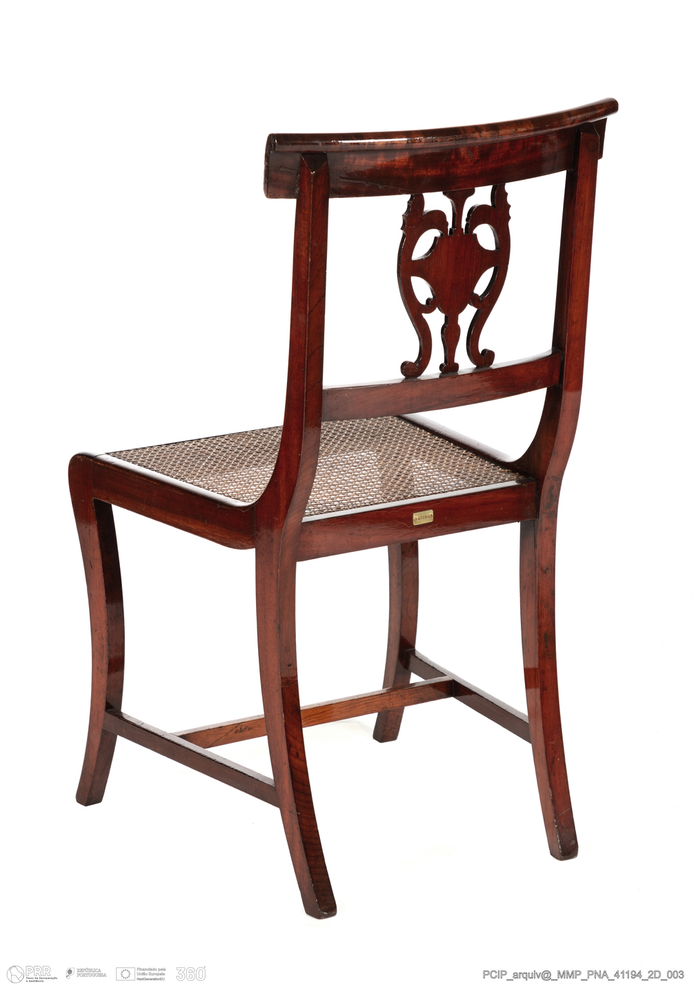 Matéria/Técnica: Madeira de mogno; palhinha; Cronologia: 1804 - 1815; Autoria: Desconhecida; Dimensões (cm): Altura: 86,5; Largura: 45,0; Profundidade: 47,5.