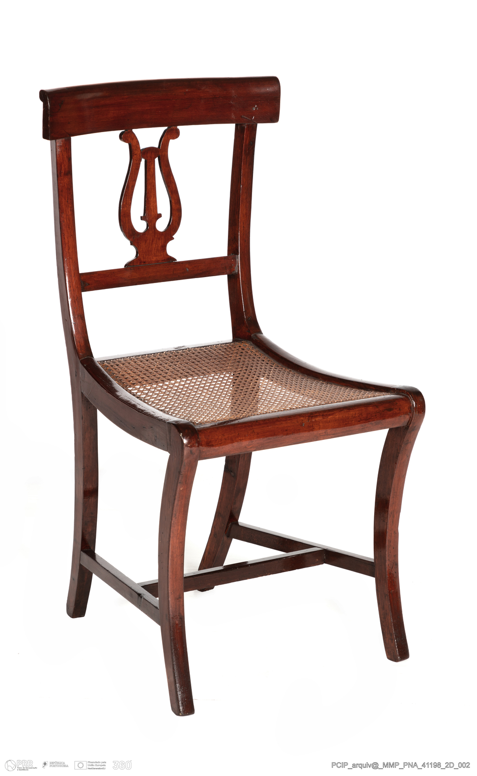 Matéria/Técnica: Madeira de mogno; palhinha; Cronologia: Século XIX; Autoria: Desconhecida; Dimensões (cm): Altura: 85,5; Largura: 43,5; Profundidade: 45,0.