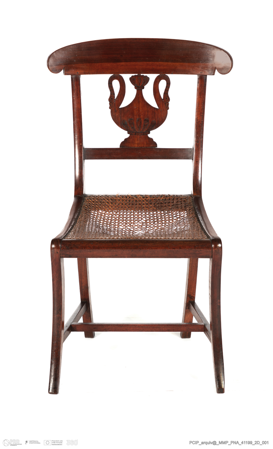 Matéria/Técnica: Madeira de mogno; palhinha; folha de ouro; Cronologia: Século XIX; Autoria: Desconhecida; Dimensões (cm): Altura: 83,0; Largura: 45,0; Profundidade: 47,5.