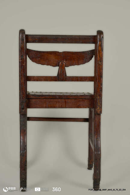 Matéria/Técnica: Madeira entalhada e envernizada, couro gravado.; Cronologia: Século XX; Autoria: Desconhecida; Dimensões (cm): Altura: 72; Largura: 39; Comprimento: 37.