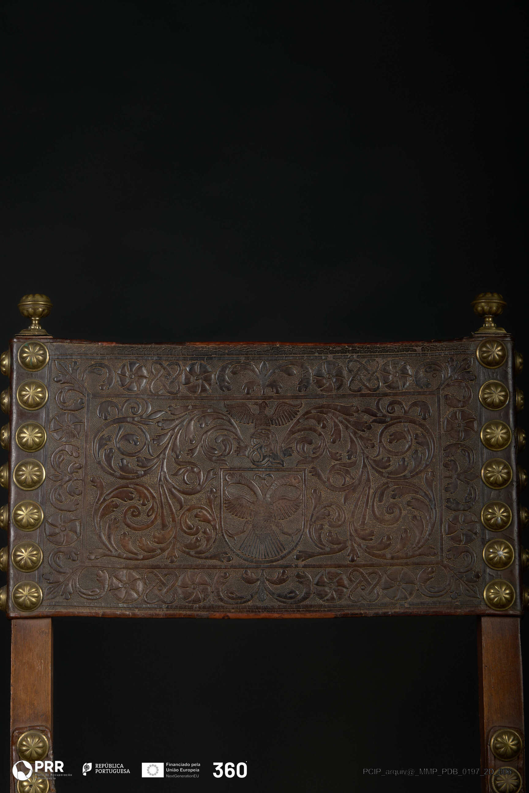 Matéria/Técnica: Couro e madeira; Cronologia: Século XVII; Autoria: Desconhecida; Dimensões (cm): Altura: 100,3; Largura: 52,8; Profundidade: 49,5.