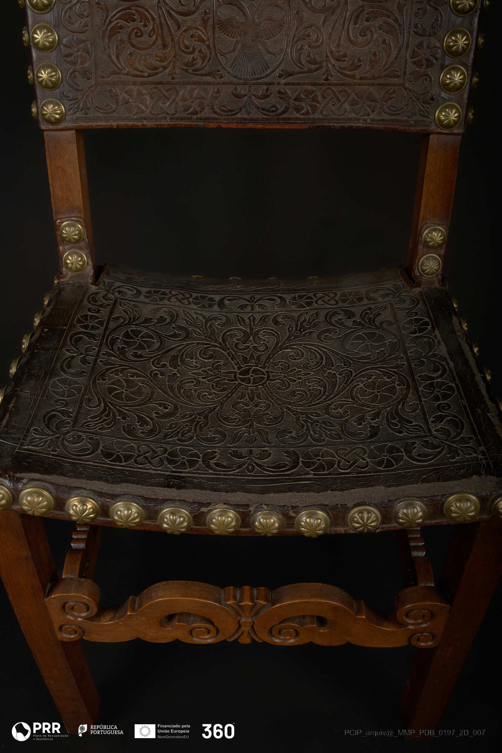Matéria/Técnica: Couro e madeira; Cronologia: Século XVII; Autoria: Desconhecida; Dimensões (cm): Altura: 100,3; Largura: 52,8; Profundidade: 49,5.