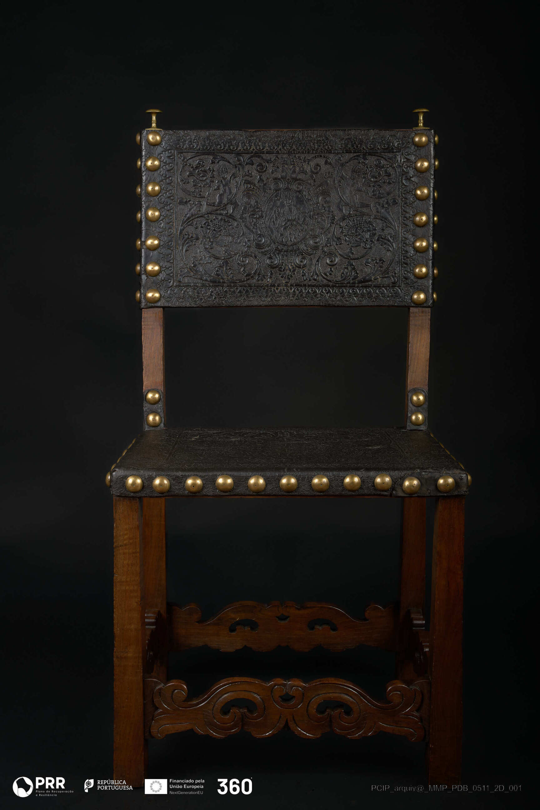 Matéria/Técnica: Couro e madeira; Cronologia: Século XVII; Autoria: Desconhecida; Dimensões (cm): Altura: 103,6; Largura: 53,3; Profundidade: 43,5.