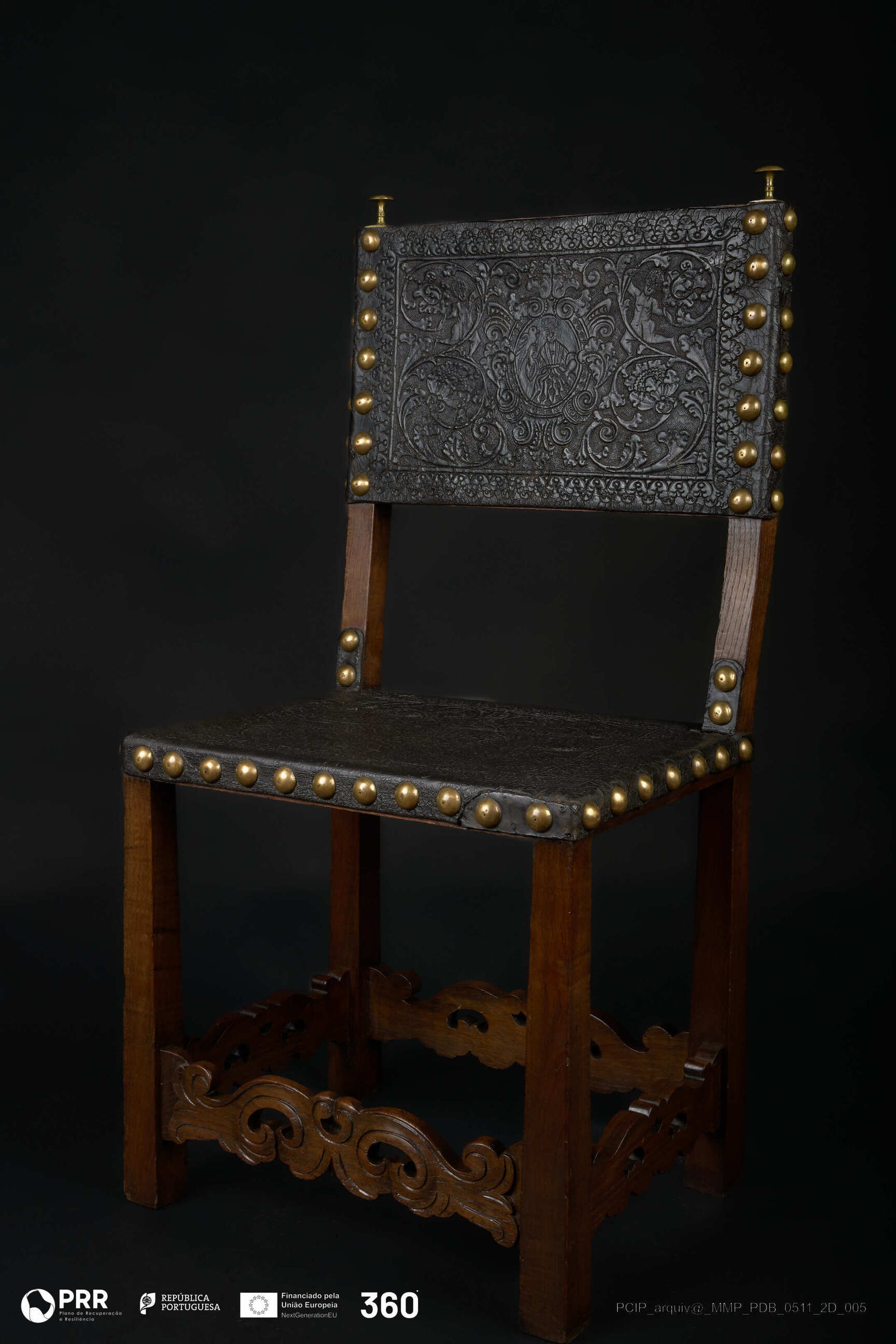 Matéria/Técnica: Couro e madeira; Cronologia: Século XVII; Autoria: Desconhecida; Dimensões (cm): Altura: 103,6; Largura: 53,3; Profundidade: 43,5.