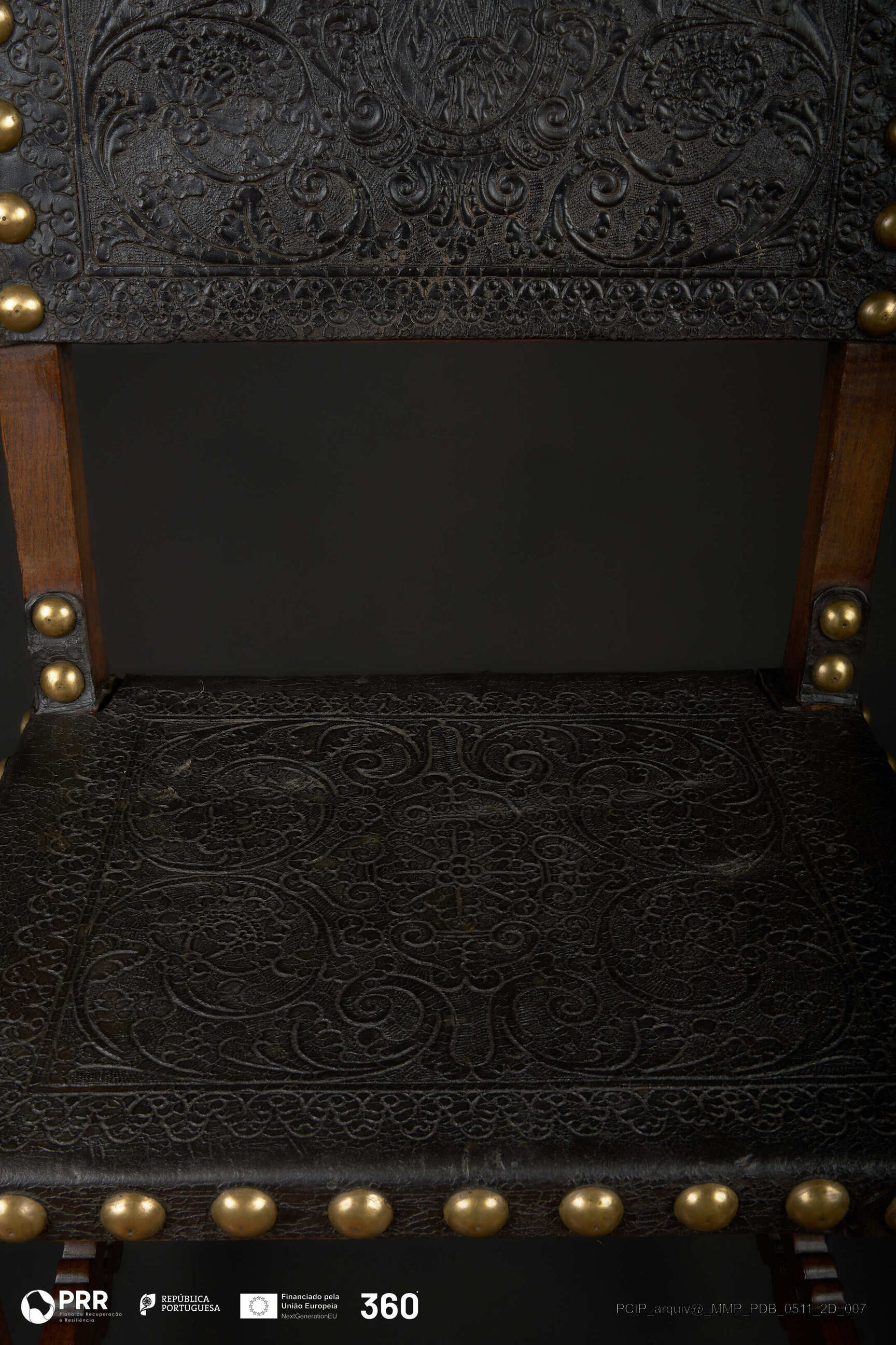 Matéria/Técnica: Couro e madeira; Cronologia: Século XVII; Autoria: Desconhecida; Dimensões (cm): Altura: 103,6; Largura: 53,3; Profundidade: 43,5.