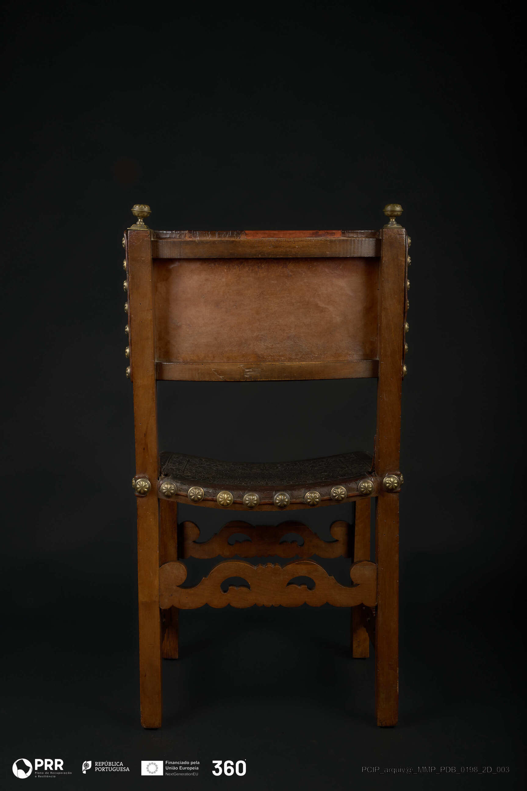 Matéria/Técnica: Couro e madeira; Cronologia: Século XVII; Autoria: Desconhecida; Dimensões (cm): Altura: 100,3; Largura: 53,1; Profundidade: 47,2.