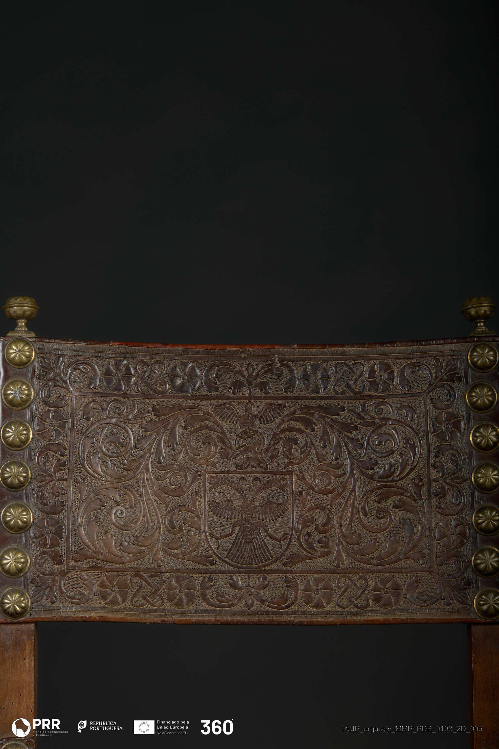 Matéria/Técnica: Couro e madeira; Cronologia: Século XVII; Autoria: Desconhecida; Dimensões (cm): Altura: 100,3; Largura: 53,1; Profundidade: 47,2.