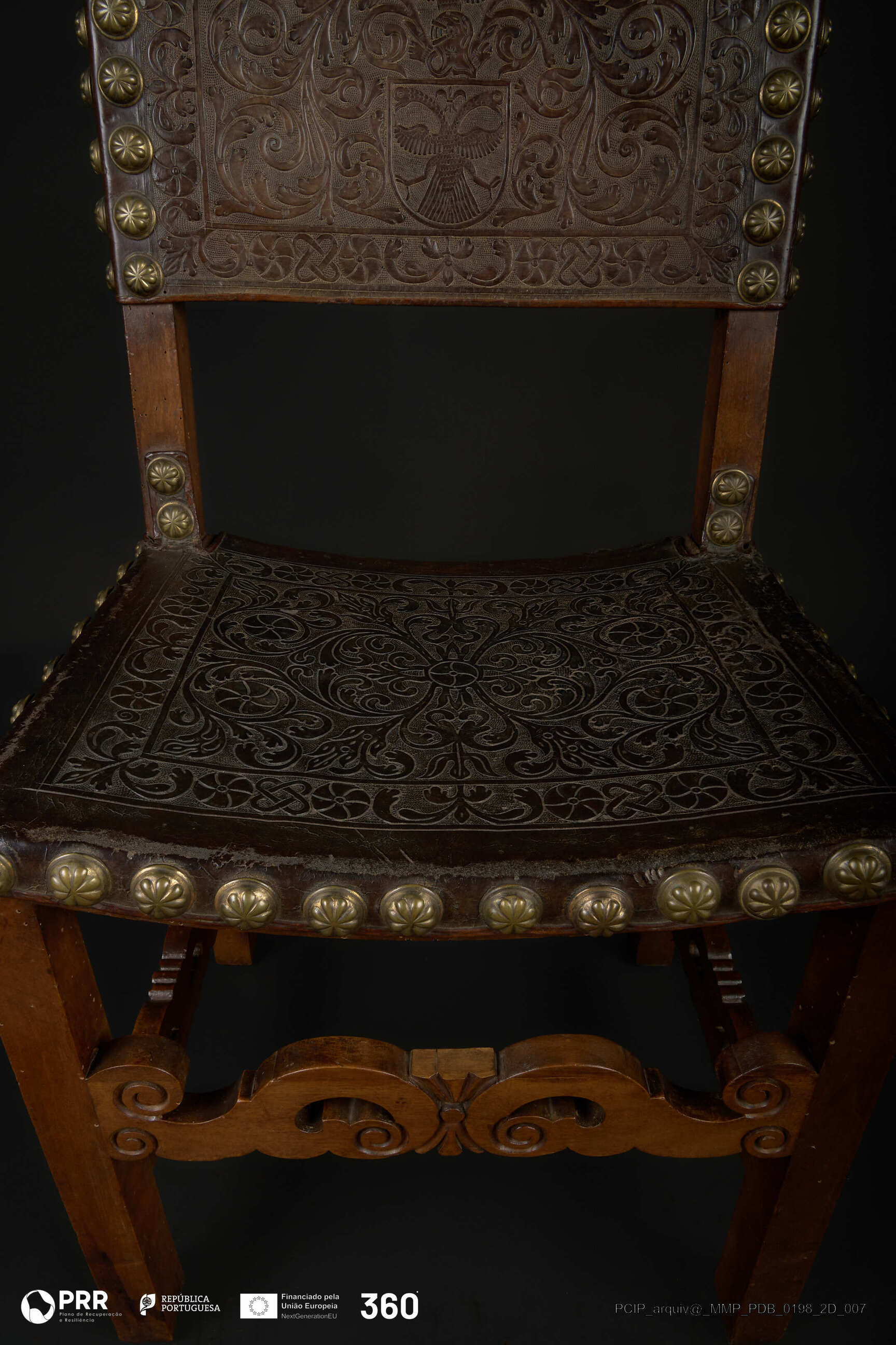 Matéria/Técnica: Couro e madeira; Cronologia: Século XVII; Autoria: Desconhecida; Dimensões (cm): Altura: 100,3; Largura: 53,1; Profundidade: 47,2.